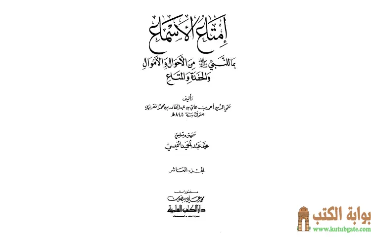 تحميل كتاب إمتاع الأسماع 10 PDF – تقي الدين المقريزي – إمتاع الأسماع هو عمل يتناول حياة الرسول صلى الله عليه وسلم وأحداثها بشكل شامل ودقيق وقد قام بتأليفه تقي الدين المقريزي ويتألف الكتاب من خمسة عشر جزءا يغطي مواضيع متعددة تتعلق بالنبي وأخلاقه ومعجزاته وألقابه وفضائله ويبدأ الجزء الأول بأسمائه وكناه وألقابه ويتناول غزوة الفتح وأسبابها بينما يتناول الجزء الثاني تتمة غزوة الفتح وأمارات نبوته التي رآها قبل البعثة.
