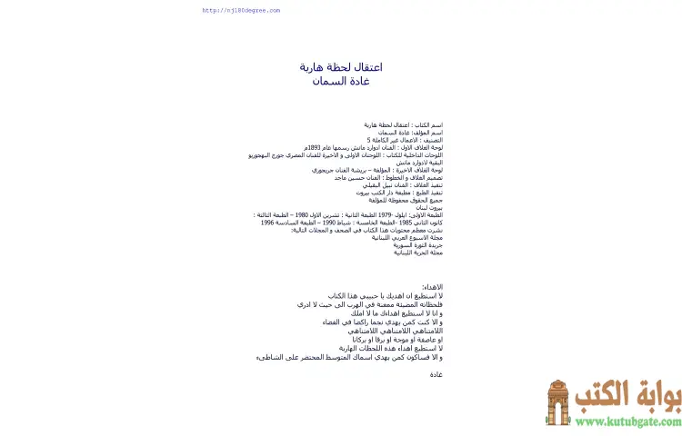 تحميل كتاب اعتقال لحظة هاربة PDF – غادة السمان – تقدم غادة السمان في كتابها "اعتقال لحظة هاربة" نصوصًا تعبر عن مشاعر عميقة وجراح متجددة، حيث تصف حال قلبها الذي يعاني من الوجع والحزن، كحزن المطر الأسود في محطة قطار نائية. تعكس كلماتها حالة من الإرهاق العاطفي، حيث تتنقل بين مشاعر الألم والحنين، معتبرة أن كل ما حولها يتوق إلى الصمت والسكينة، في وقت لا تتوقف فيه الأصوات من حولها عن الثرثرة، وكأنها تسعى لتعويض المعنى الحقيقي بالكلام.