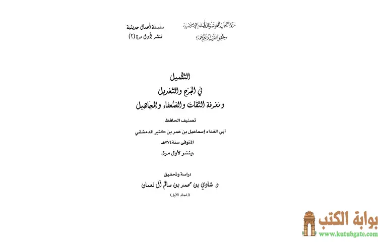 تحميل كتاب التكميل في الجرح والتعديل ومعرفة الثقات والضعفاء والمجاهيل 1 PDF – ابن كثير – يعد كتاب التكميل في الجرح والتعديل ومعرفة الثقات والضعفاء والمجاهيل من المراجع الأساسية والمهمة للباحثين في مجال علوم الحديث الشريف، حيث يقدم معلومات دقيقة وشاملة حول تقييم رواة الحديث. يسهم الكتاب في توضيح ضوابط الجرح والتعديل، مما يجعله أداة فعالة للمشتغلين في هذا المجال. كما يتناول الكتاب بعض الجوانب المتعلقة بالثقات والضعفاء والمجاهيل، مما يساعد على فهم أعمق لتاريخ الحديث ودراسته.