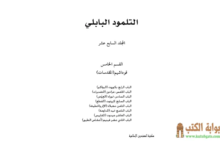 تحميل كتاب التلمود البابلي 17 PDF – الرابي آشي – التلمود البابلي المعروف أيضًا باسم چمراه هو عمل جماعي يمثل تجميعًا للأفكار التشريعية والأسطورية والتصويرية التي وضعها الأمورائيم وهم حكماء إسرائيل في الفترة التي تلت اختتام المشنا ويضم آراء وتفسيرات تتعلق بالشريعة اليهودية وقضايا الحياة اليومية