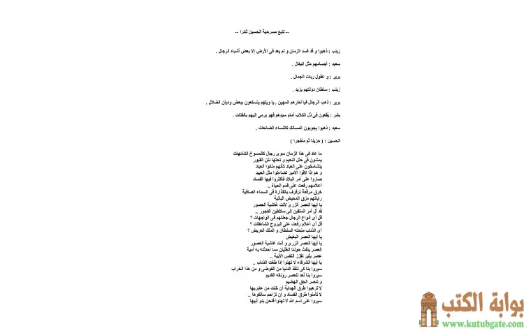 تحميل كتاب الحسين شهيدا PDF – عبد الرحمن الشرقاوي – تعتبر مسرحية الحسين شهيدا لعبد الرحمن الشرقاوي عملاً أدبيًا بارزًا يجسد واقعة استشهاد الحسين رضي الله عنه بطريقة تجذب القارئ وتجعله يعيش تلك اللحظات التاريخية كأنها تحدث أمام عينيه. يتميز النص بلغة شاعرية عالية تعكس البيئة التي ينتمي إليها الحسين، مما يجعل المسرحية تختلف عن الأعمال المسرحية الأخرى المتأثرة بالتيارات الغربية أو الشعر الملحمي الإغريقي.
