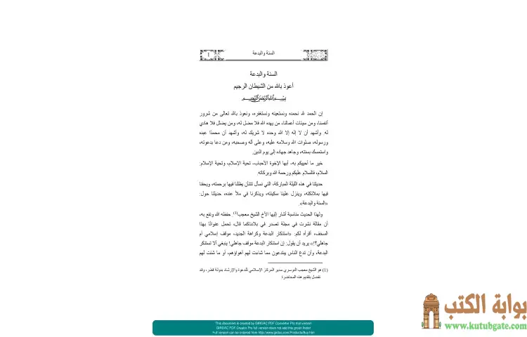 تحميل كتاب السنة والبدعة PDF – يوسف القرضاوي – يتناول كتاب "السنة والبدعة" للشيخ يوسف القرضاوي موضوعًا مهمًا في الإسلام يتعلق بفهم السنة النبوية ومعنى البدعة. يبدأ الكتاب بتعريف السنة كطريقة النبي محمد صلى الله عليه وسلم في العبادة والسلوك، بينما تُعرف البدعة بأنها كل ما أُحدث في الدين دون دليل شرعي. يشدد المؤلف على أهمية تحديد المفاهيم بدقة، حيث إن ترك الأمور دون توضيح يؤدي إلى تفاسير مختلفة قد تضر بالمعاني الحقيقية.