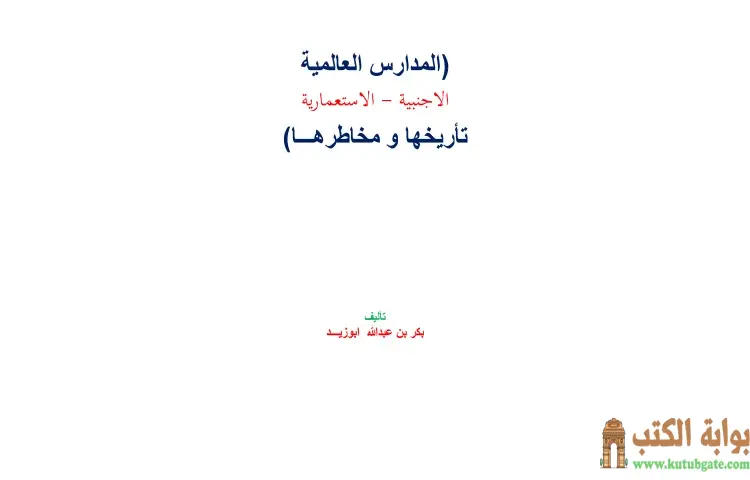 تحميل كتاب المدارس العالمية الأجنبية الإستعمارية تاريخها ومخاطرها PDF – بكر بن عبدالله أبو زيد – يتناول كتاب المدارس العالمية الأجنبية الاستعمارية تاريخها ومخاطرها للكاتب بكر بن عبدالله أبو زيد موضوع الاستعمار الفكري الذي تعرض له المسلمون على يد أعداء الله من عباد الصليب وغيرهم من الكافرين حيث يعتبر هذا النوع من الاستعمار أشد تأثيراً من الحروب المسلحة. يقدم الكاتب رؤية تحليلية حول المعركة الفكرية الماكرة التي استهدفت عقول المسلمين وقلوبهم بهدف طمس هويتهم الإسلامية وتحويلهم إلى مجتمع يتبنى القيم الغربية في أخلاقه ومبادئه مما يؤدي إلى تنافره مع الدين الإسلامي الحق.