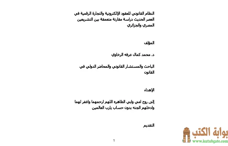 تحميل كتاب النظام القانوني للعقود الإلكترونية والتجارة الرقمية في العصر الحديث PDF – محمد كمال الرخاوي – يستعرض كتاب "النظام القانوني للعقود الإلكترونية والتجارة الرقمية في العصر الحديث" للدكتور محمد كمال الرخاوي دراسة مقارنة تفصيلية بين التشريعات المصرية والجزائرية. يتناول الكتاب الأطر القانونية المنظمة للعقود الإلكترونية في ظل التطورات السريعة التي يشهدها العالم الرقمي، حيث يسلط الضوء على كيفية توافق القوانين مع المستجدات التكنولوجية.