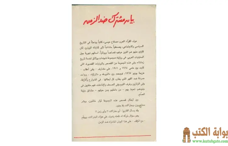 تحميل كتاب بيان مشترك ضد الزمن PDF – صلاح عيسى – صلاح عيسى هو كاتب وباحث معروف في مجالات التاريخ السياسي والاجتماعي، إضافة إلى كونه صحفياً مثيراً للجدل. رغم شهرته في الكتابات الصحفية، فإن القليل من القراء يعرفونه كقاص وروائي، حيث استلهم من أحداث جيل الستينات العربي.
