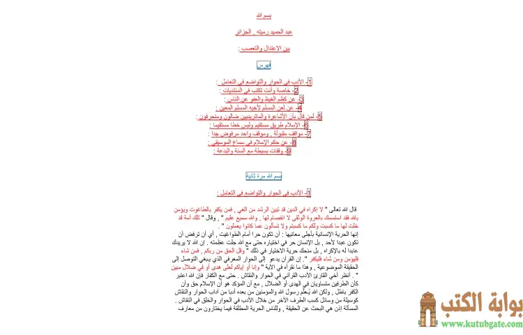 تحميل كتاب بين الاعتدال والتعصب PDF – عبدالحميد رميته – بين الاعتدال والتعصب هو عمل من تأليف عبدالحميد رميته يتناول مجموعة من الموضوعات المهمة التي تتعلق بالأدب في الحوار والتواضع في التعامل مع الآخرين، خاصة في سياق الكتابة في المنتديات. يناقش الكتاب مفهوم كظم الغيظ والعفو عن الناس، موضحاً أهمية هذه القيم في تعزيز العلاقات الإنسانية. كما يتطرق إلى مسألة لعن المسلم لأخيه المسلم، مشيراً إلى الأثر السلبي الذي يتركه هذا السلوك على وحدة المجتمع المسلم.