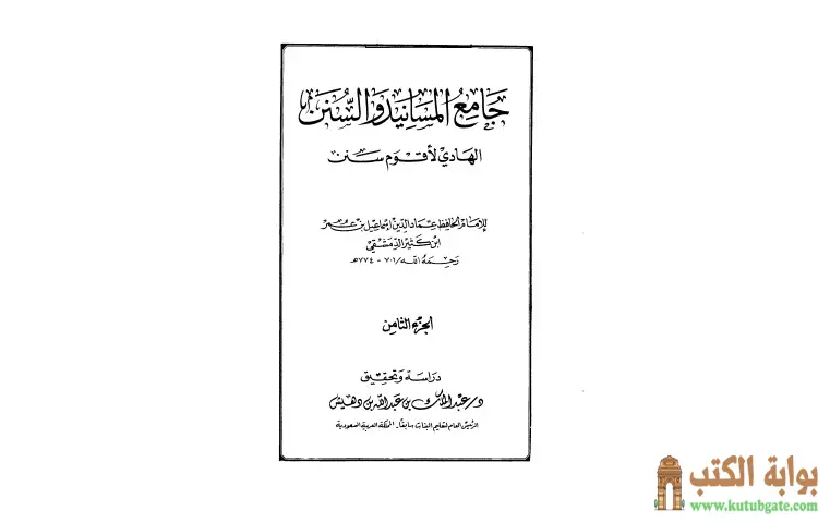 تحميل كتاب جامع المسانيد والسنن الهادي لأقوم سنن 8 PDF – ابن كثير – جامع المسانيد والسنن الهادي لأقوم سنن هو كتاب ألفه الحافظ أبو الفداء إسماعيل بن عمر بن كثير القرشي البصري ثم الدمشقي المولود عام 700 هـ والمتوفى عام 774 هـ ويقال إنه فقد بصره أثناء تأليفه لهذا الكتاب حيث كان يكتب فيه ليلاً حتى فقد بصره ويأمل أن يتولى شخص ما إكماله لما يحتويه من سهولة في التدوين وقد أشار إلى أنه لم يكن في معجم الطبراني الكبير أي شيء من مسند أبي هريرة رضي الله عنه