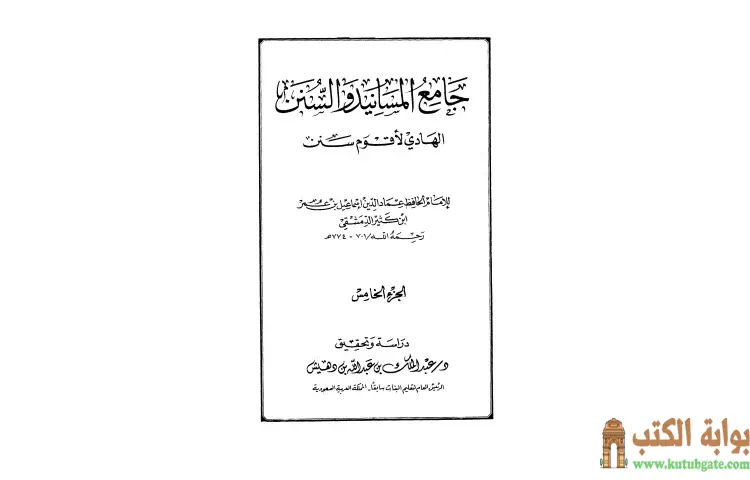 تحميل كتاب جامع المسانيد والسنن الهادي لأقوم سنن 5 PDF – ابن كثير – جامع المسانيد والسنن الهادي لأقوم سنن هو كتاب ألفه الحافظ أبو الفداء إسماعيل بن عمر بن كثير القرشي البصري ثم الدمشقي الذي عاش بين عامي 700 هـ و774 هـ، ويعتبر من الأعمال الفريدة في مجال الحديث النبوي. يُروى أن ابن كثير فقد بصره أثناء تأليفه لهذا الكتاب، حيث كان يسهر ليلاً ويكتب في ضوء السراج حتى فقد بصره، وكان يتمنى أن يقيض الله له من يكمل هذا العمل المميز. الكتاب يعتمد في ترتيبه على ترتيب محمد بن عبد الله بن المحب الصامت لمسند أحمد، حيث أضاف إليه أحاديث من الكتب الستة ومعجم الطبراني الكبير ومسند البزار ومسند أبي يعلى الموصلي.