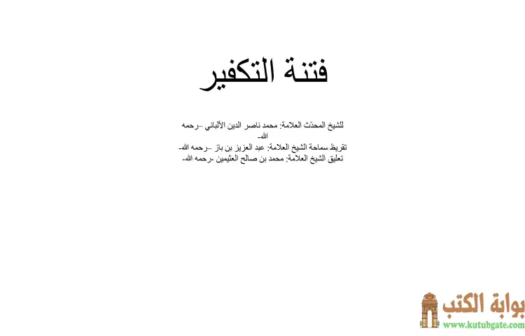 تحميل كتاب فتنة التكفير PDF – محمد ناصر الدين الألباني – فتنة التكفير هو كتاب للشيخ محمد ناصر الدين الألباني يتناول موضوع التكفير في الإسلام وما يرتبط به من قضايا فكرية وعقدية ويشمل الكتاب تقريظا من سماحة الشيخ عبد العزيز بن باز وتعليقا من الشيخ محمد بن صالح العثيمين حيث يتضمن آراءهم حول أهمية الموضوع وضرورة الفهم الصحيح له