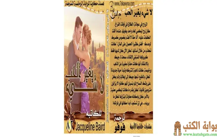 تحميل كتاب لاشيء يغير الحب PDF – جاكلين بيرد – في رواية لا شيء يغير الحب للكاتبة جاكلين بيرد، تدور الأحداث حول ليكسي التي عانت من خيانة زوجها جيك بعد عام واحد من زواجهما. تعكس الرواية صراع ليكسي الداخلي بين مشاعرها الجريحة وكبريائها الذي يمنعها من التعبير عن أوجاعها. بينما تبدو للآخرين وكأنها تبدي اهتمامًا أكبر بالمال، إلا أن ما يخفيه قلبها هو رغبتها في التعافي من جراح الحب المكسور.