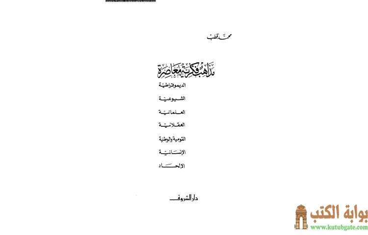 تحميل كتاب مذاهب فكرية معاصرة PDF – محمد قطب – مذاهب فكرية معاصرة هو كتاب من تأليف محمد قطب يتناول بالتحليل والنقد مجموعة من المذاهب والأيديولوجيات المعاصرة التي أثرت في الفكر الإسلامي والمجتمع المسلم. يتكون الكتاب من 654 صفحة ويعرض سبعة مذاهب رئيسية تشمل الشيوعية والديموقراطية والعلمانية والعقلانية والقومية والوطنية والإنسانية والإلحاد.