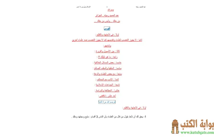 تحميل كتاب من حقك وليس من حقك PDF – عبدالحميد رميته – كتاب من حقك وليس من حقك للمؤلف عبدالحميد رميته يتناول مجموعة من الموضوعات المتعلقة بالاجتهاد والتقليد في الفقه الإسلامي. يتطرق في البداية إلى مفهوم الاجتهاد وأهميته، مشدداً على ضرورة عدم التعصب لعلماء معينين أو تقديسهم، كما أنه يحذر من التعصب ضد علماء آخرين أو شتمهم.