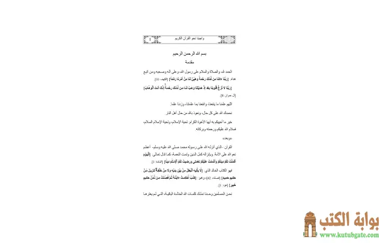 تحميل كتاب واجبنا نحو القرآن الكريم PDF – يوسف القرضاوي – 'واجبنا نحو القرآن الكريم' هو كتيب يتناول محاضرة للشيخ يوسف القرضاوي، حيث يبدأ بالتحميد والصلاة على النبي محمد صلى الله عليه وسلم، ثم يستعرض عظمة القرآن الكريم كأعظم نعمة أنزلها الله على الأمة. يشير الشيخ إلى أن إنزال القرآن كمل الدين وأتم النعمة، مستشهداً بآيات من القرآن تؤكد ذلك، مثل قوله تعالى "اليوم أكملت لكم دينكم وأتممت عليكم نعمتي" مما يعكس أهمية القرآن ككتاب خالد لا يأتيه الباطل.