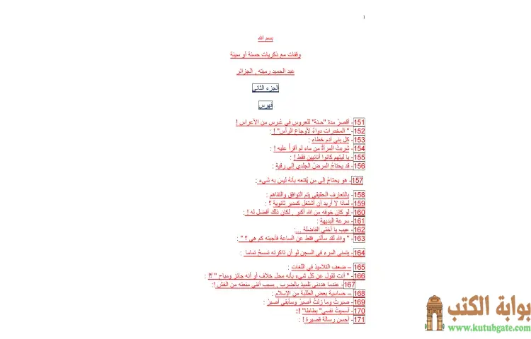 تحميل كتاب وقفات مع ذكريات حسنة أو سيئة 2 PDF – عبدالحميد رميته – في كتاب "وقفات مع ذكريات حسنة أو سيئة" للكاتب عبدالحميد رميته، يقدم المؤلف مجموعة من المذكرات التي تهدف إلى تحقيق عدة أهداف تعليمية وإرشادية. يسعى الكاتب من خلال هذه الذكريات إلى تعليم الناس الدين من خلال استعراض بعض مسائل الحلال والحرام، خصوصاً في مجالات المعاملات، إضافة إلى تقديم دروس في الآداب والأخلاق الإسلامية. يشتمل الكتاب أيضاً على الحكم والأمثال التي تأتي في سياق الذكريات، مما يعزز من القيم التي يسعى الكاتب لتجسيدها في حياة القارئ.